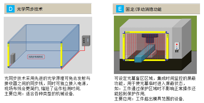 7、屏蔽功能:安諧安全光柵光幕具有固定屏蔽和浮動(dòng)屏蔽功能,可以在保證安全的前提下,最大化提高生產(chǎn)效率;