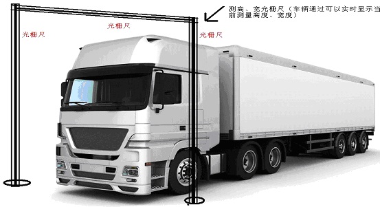 輪廓儀系統(tǒng)測量原理:引車員將車輛以3~5km/h的速度駛?cè)霚y量裝置區(qū)域,測量裝置中的對射式一線紅外地位開關(guān)開始工作。車輛的頭部行駛到定位開關(guān)時(shí),安裝在車輛上方左右兩邊的測量車輛寬度和高度的電子尺開始工作。被測車輛的尾部駛離最后一組定位開關(guān)時(shí),輪廓信息全部得出。最后經(jīng)過信號高速處理和軟件合成,精確測量出車輛輪廓信息。